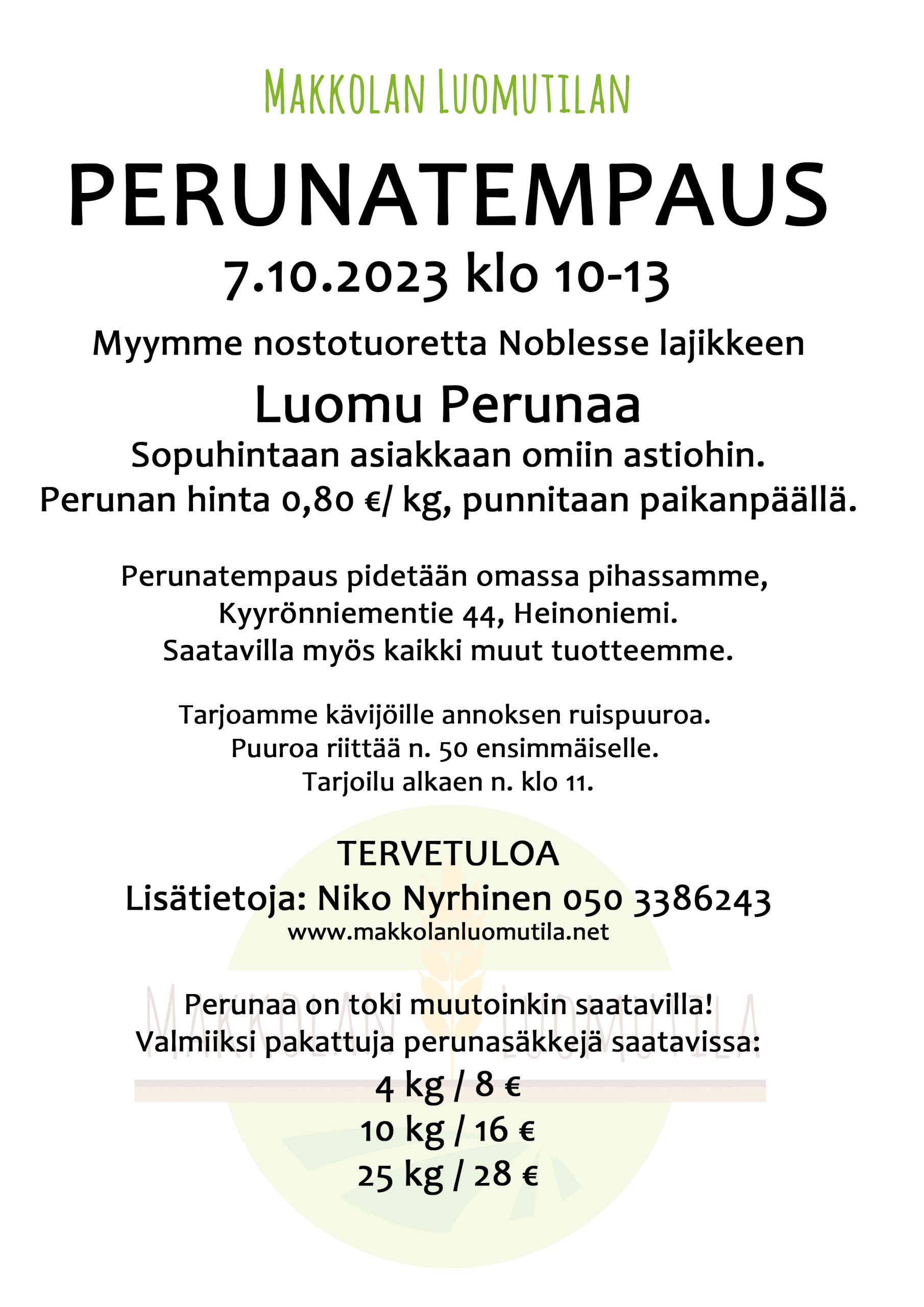 Aiempina vuosina mukavasti onnistuneiden tapahtumien myötä, pidämme tilamme historian kolmannen perinteisen myyntipäivän, eli ”perunatempauksen” 7.10.2023 klo 10-13.